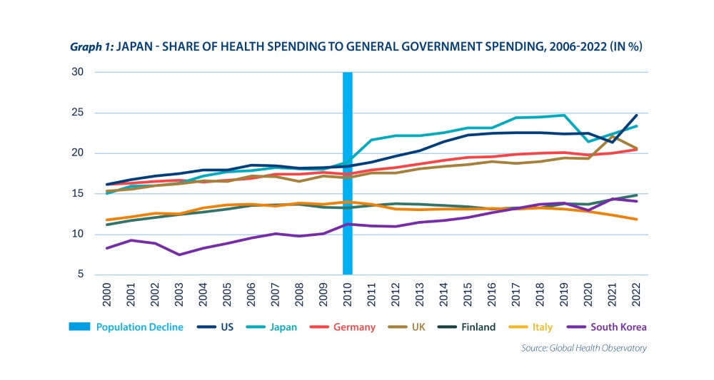 These demographic changes are straining public finances through rising pension obligations and increasing healthcare costs. In Japan, social security expenditures account for more than one-third, or JPY 38.3 trillion (USD 26.8 billion), of the 2025 national budget to address child-rearing and health concerns. Additionally, the increase in government health spending correlates to the population decline in Japan as seen in Graph 1, accounting for about 25 per cent of annual public spending between 2017 and 2019.