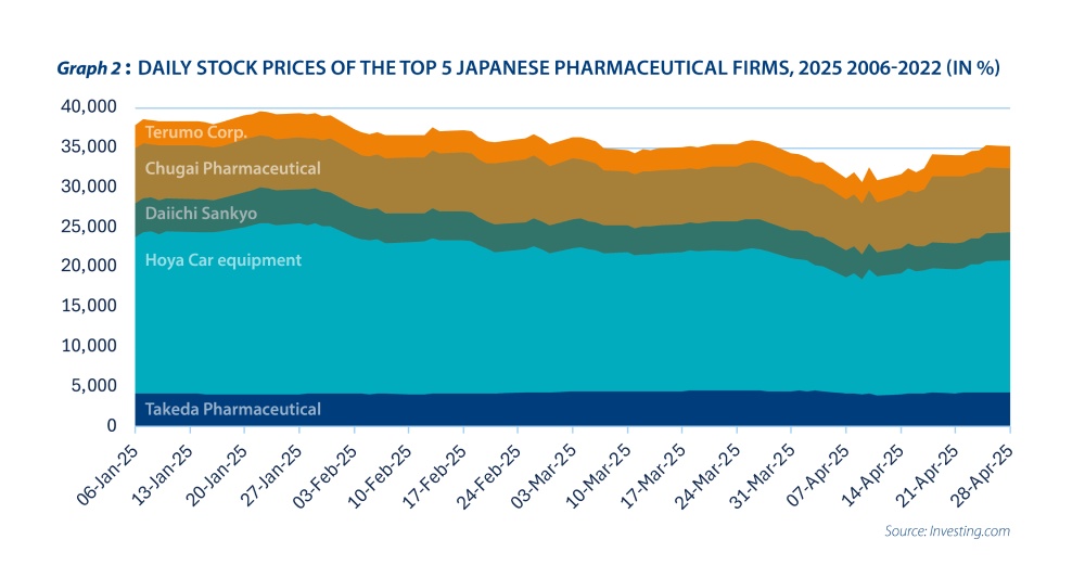 The resounding focus on health technologies has also intensified investments in healthcare-related stocks. Graph 2 shows that Japanese pharmaceutical firms such as Takeda Pharmaceutical, Daiichi Sankyo, and Terumo saw relatively stable stock market performance in April despite some turbulence in global indices. MSCI Japan’s healthcare index performance over the years also portrayed the sector’s overall attractiveness to investors.