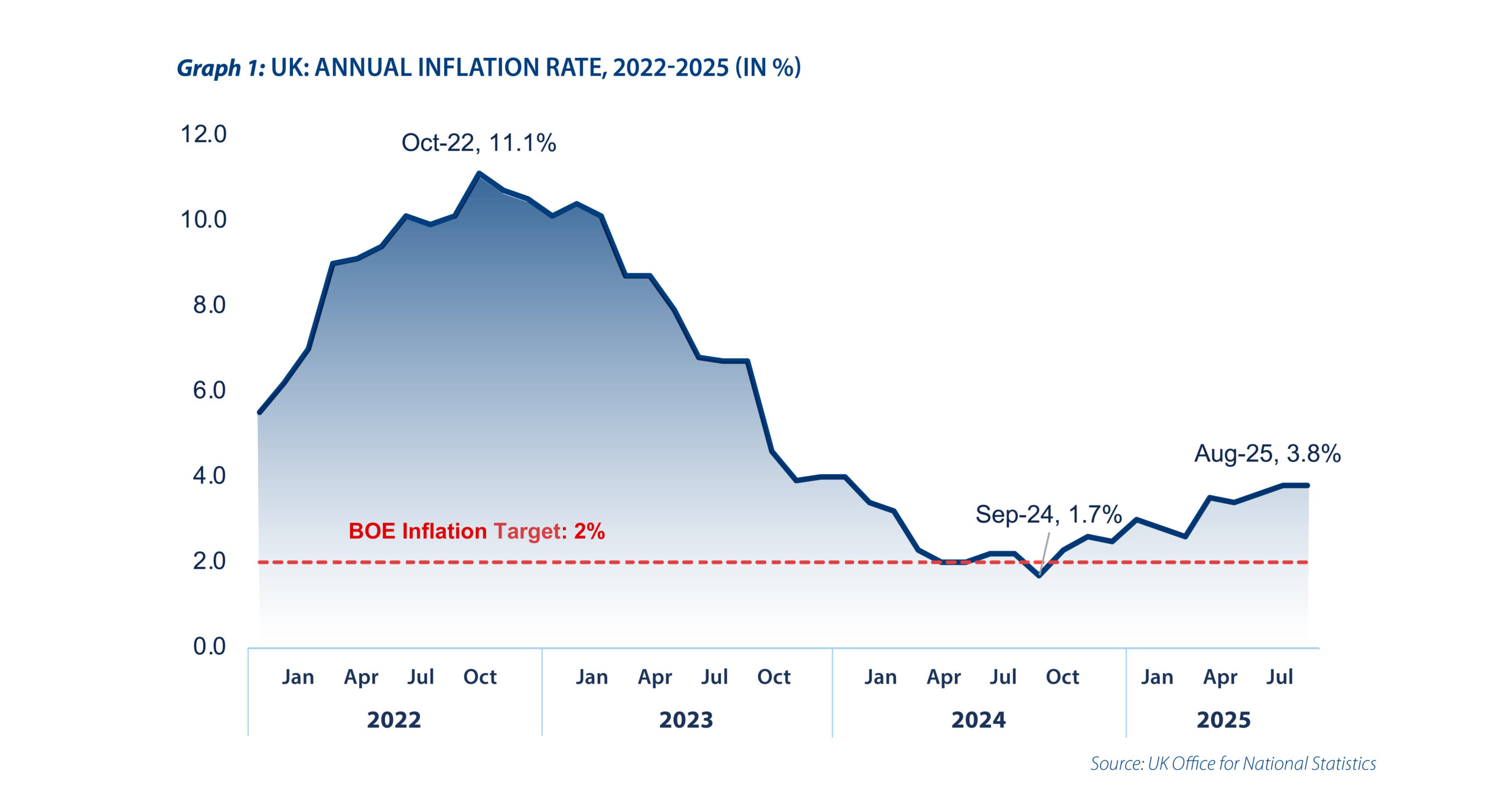 Latest data show that inflation in the UK has been creeping up again despite initially slowing down in past months. August inflation at 3.8 per cent is the highest rate since a low of 1.7 per cent tallied in September 2024. This, however, is still significantly lower than the peak 11.1 per cent reported in October 2022, as seen in Graph 1. This is primarily driven by the effects of the Russia-Ukraine war on energy and food prices. According to the Office for National Statistics, UK’s inflation rate is driven by rapid price increases for housing, water, electricity, gas and other fuels (7.4 per cent), as well as food and non-alcoholic beverages (5.1 per cent).