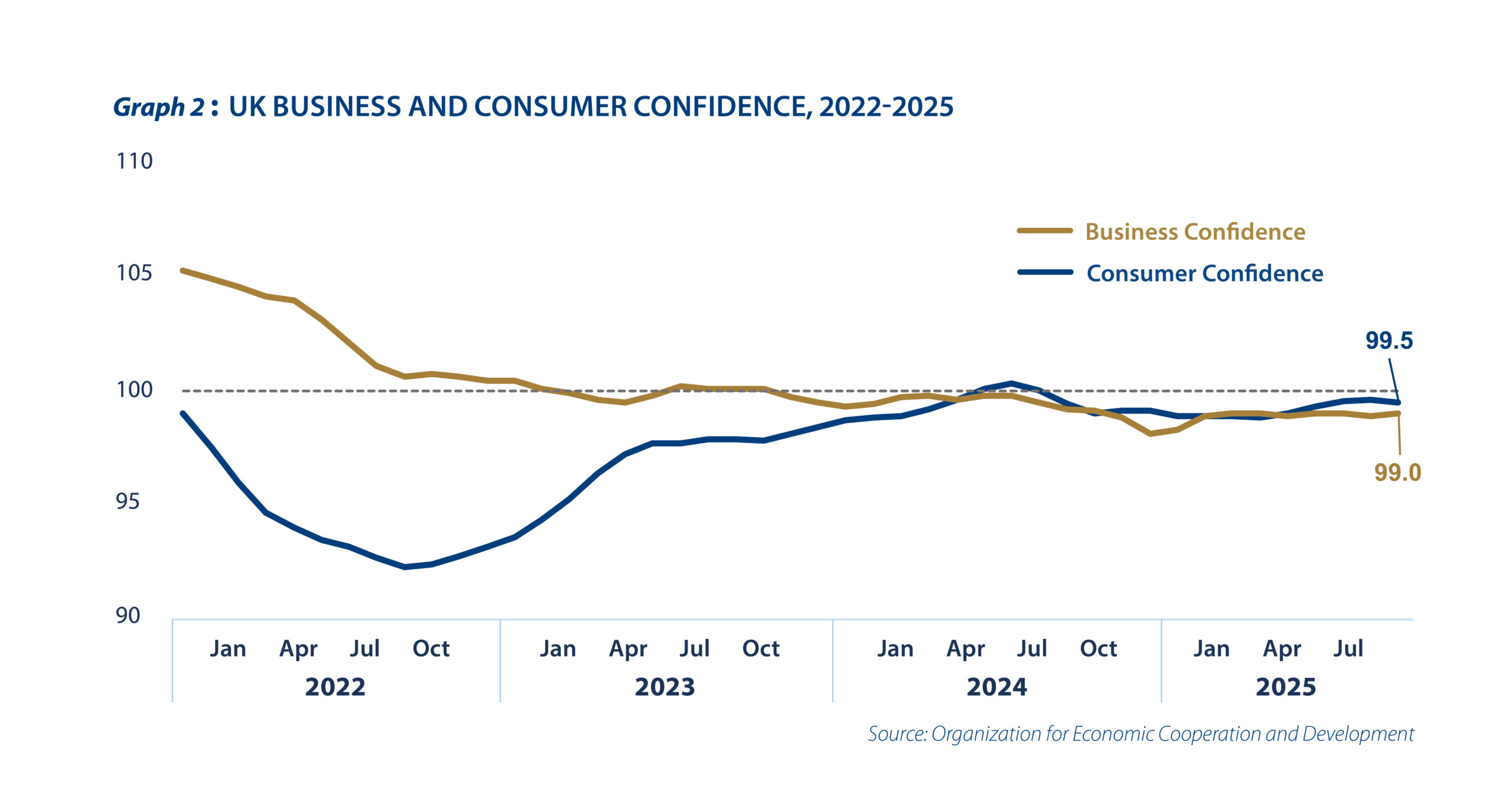 Amid this environment, the confidence of both consumers and businesses have turned negative since September 2024. Graph 2 shows that the general outlook on both sides remains gloomy, with the two indices averaging below the neutral threshold of 100 as of August. Households were the most pessimistic when inflation hit peak levels in 2022 due to the effects of the Russia-Ukraine war. Consumer confidence has slightly improved over the past six months though it remains negative. British families are already feeling the squeeze from rapidly rising prices, particularly for food items.